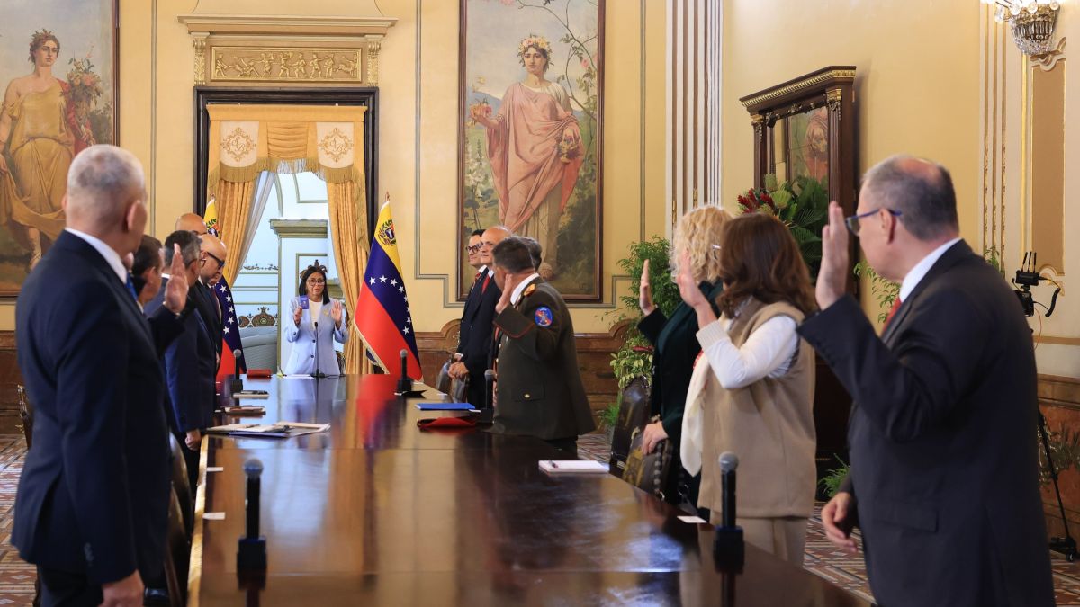 La presidenta Encargada de la República Bolivariana de Venezuela, Delcy Rodríguez, durante la ceremonia oficial de juramentación de los nuevos integrantes del Gabinete Ejecutivo desde el Palacio de Miraflores, oficializó el inicio de gestión de cada uno de los ministros designados.